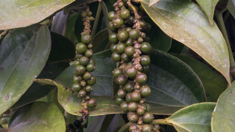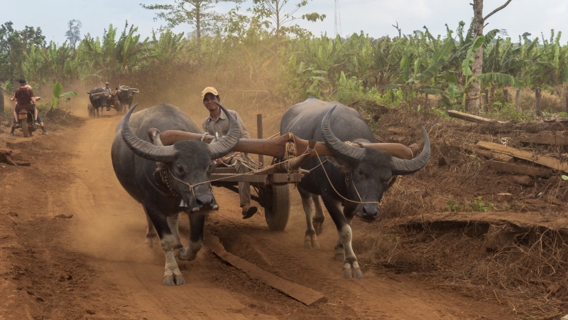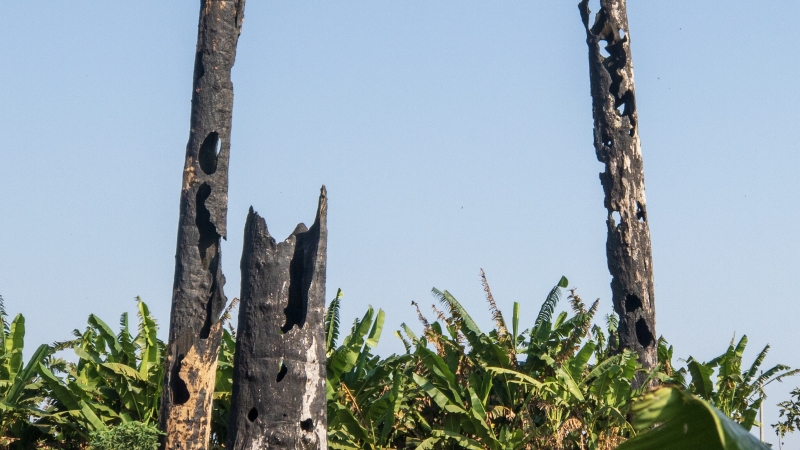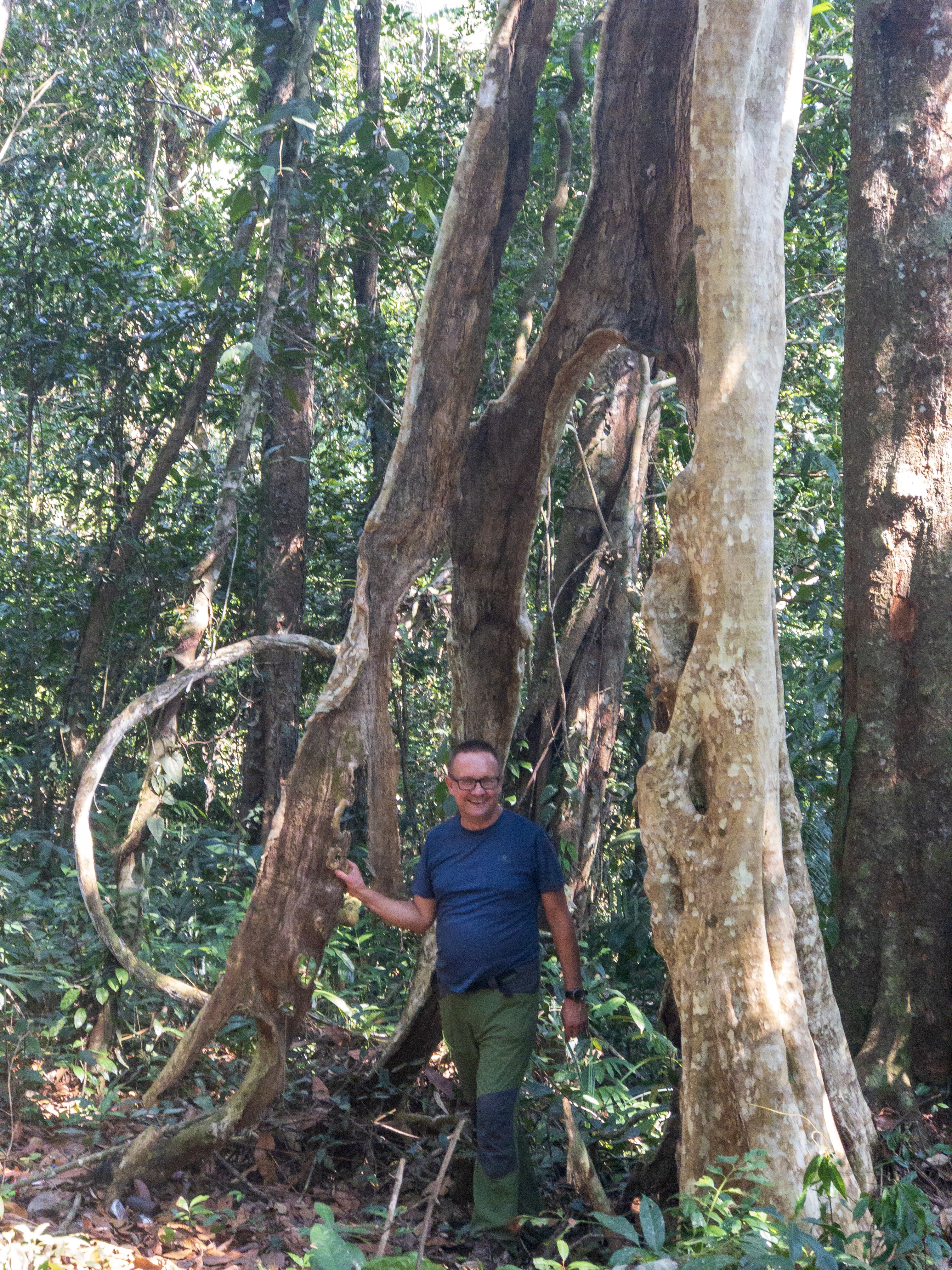 Das Gebiet um Osoam ist landwirtschaftlich genutzt sodass man zunächst ein bisschen fahren muss um zum Ausgangspunkt der Tour zu gelangen. Überall sieht man noch verkohlte Baumstämme wie Mahnmale in den Himmel ragen. Sie zeugen von der vorangegangenen Brandrodung bevor hier Bananen, Zitronen, Ananas, Pfeffer und Kardamom angebaut werden konnten.