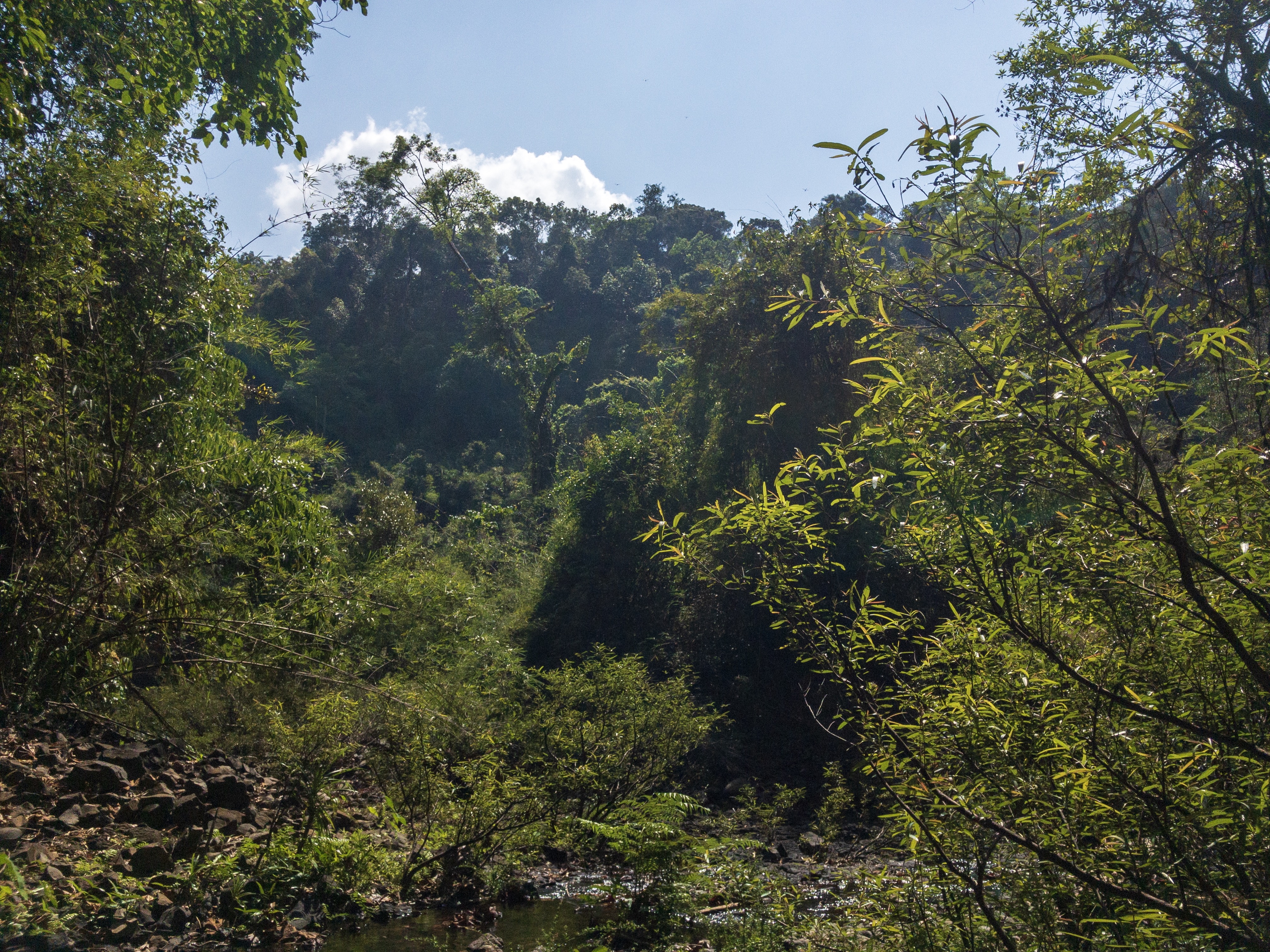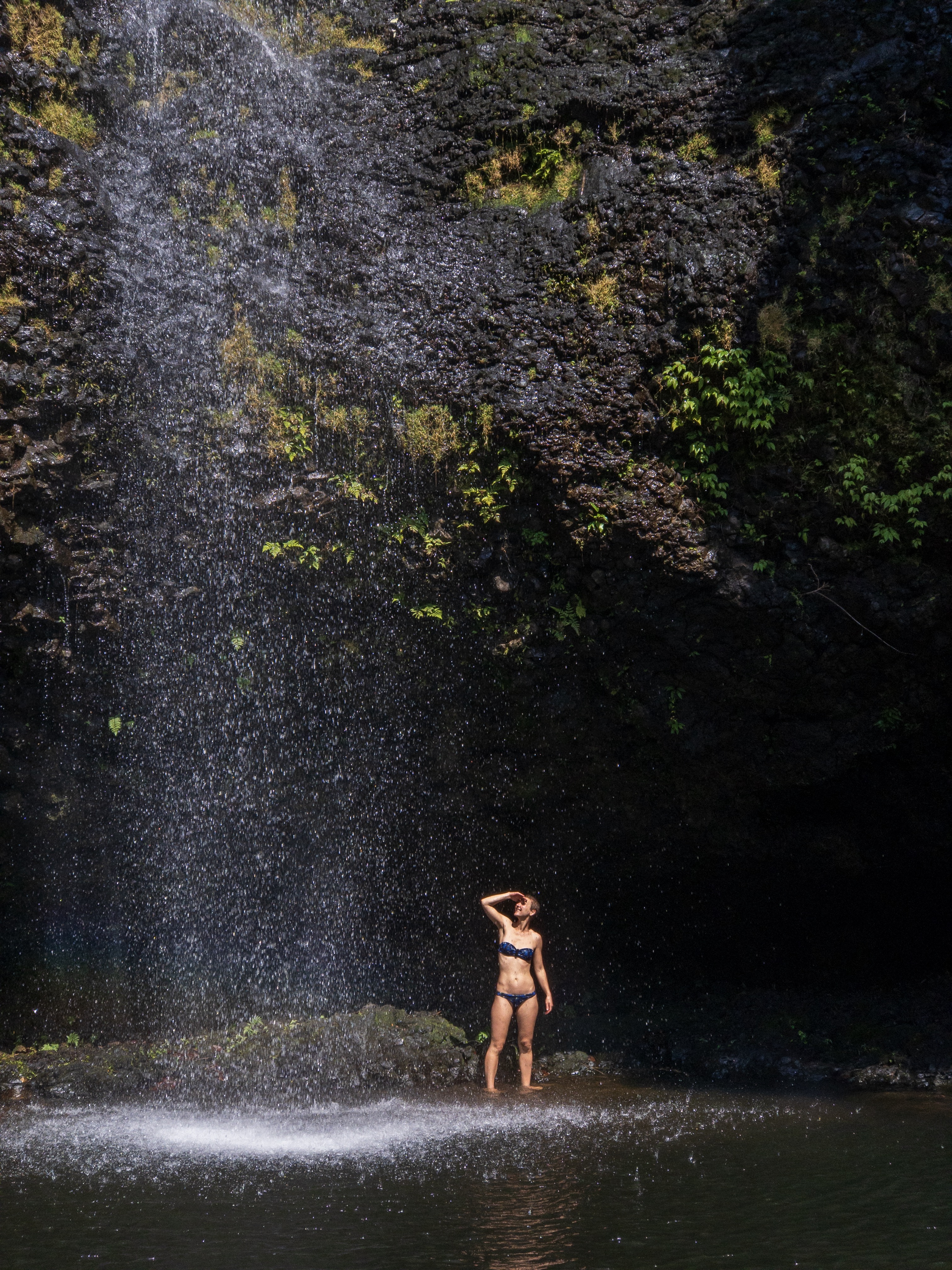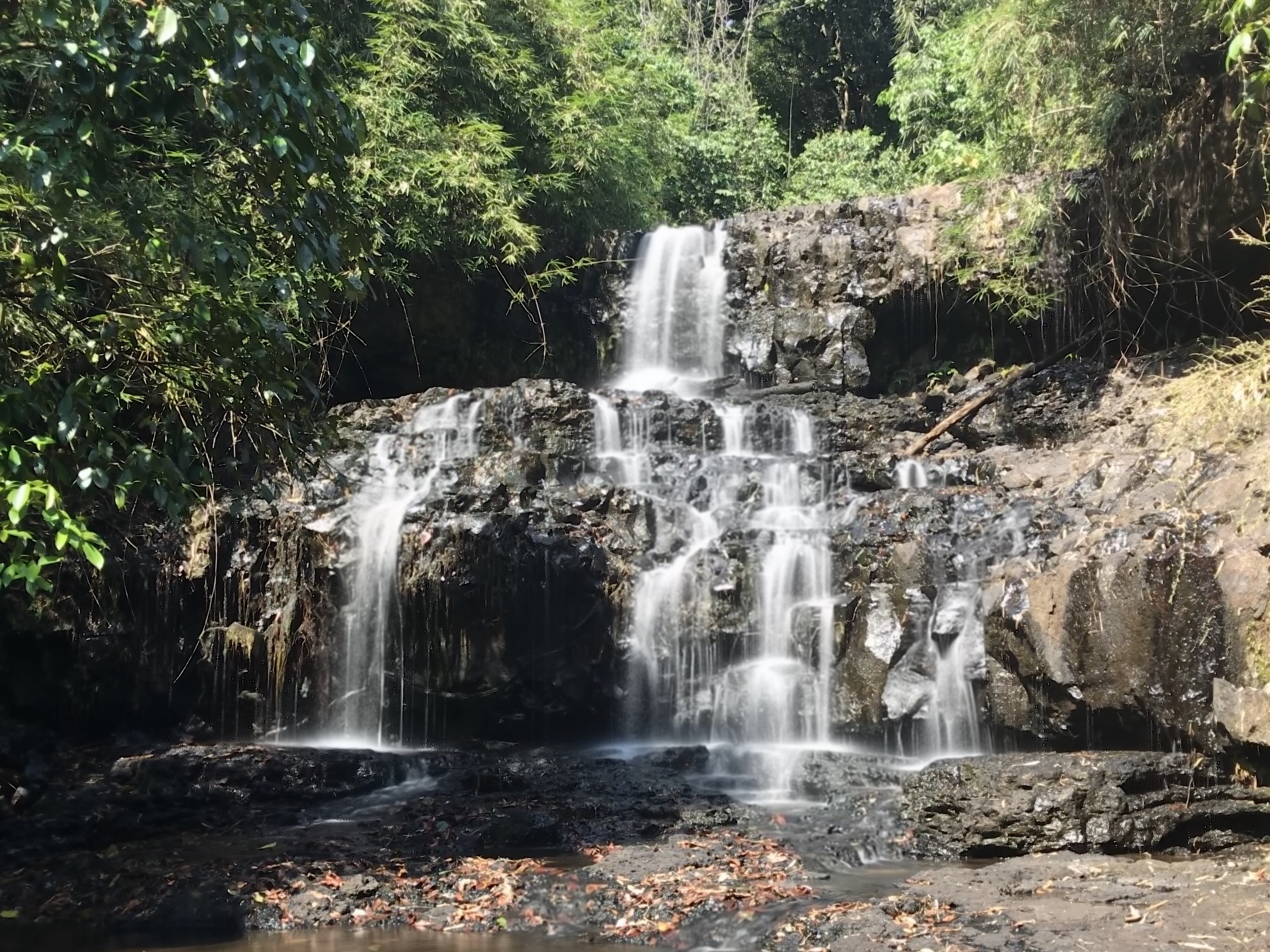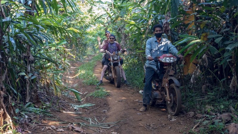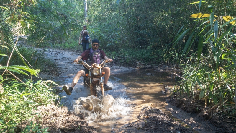 Im Wald ist es nur noch ein Singletrail, aber mein Guide fährt weiter bis ich schließlich absteige. Ich möchte ja auch noch den Dschungel ohne Motorengeräusch genießen. Nach einer weiteren Stunde erreichen wir dann das Ziel: Zwei Wasserfälle, die auch zu einem Mittagsbad einladen.