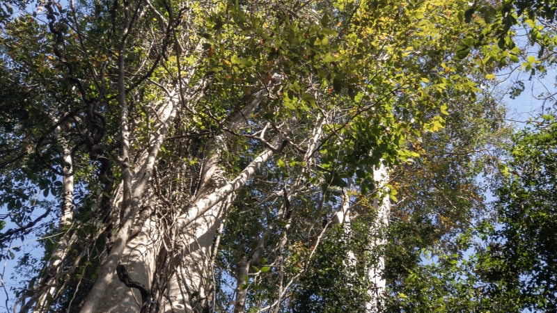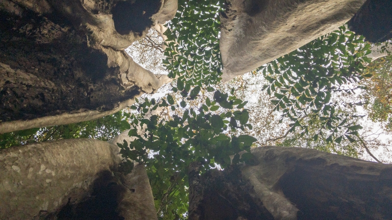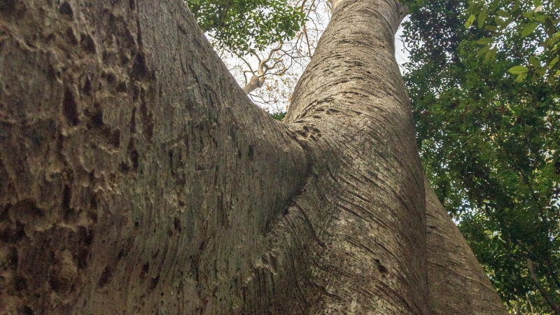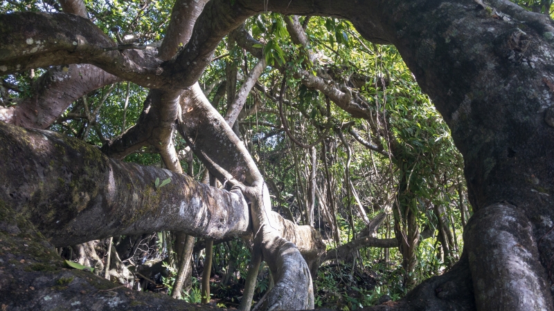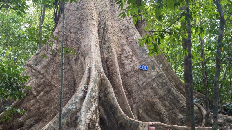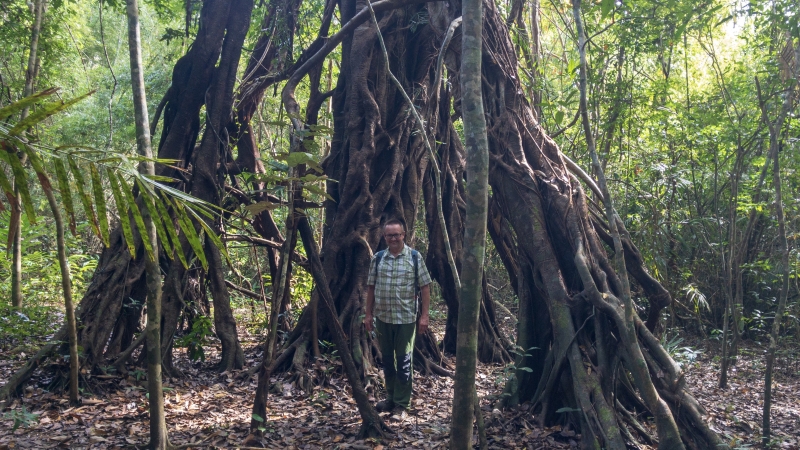 Mein Ziel ist ein riesiger Ficus mit angeblich 100 Wurzeln. Die Zahl könnte aber stimmen, denn es ist wirklich ein gewaltiges Geflecht. Auf dem Weg kann ich auch noch einige Gibbons beobachten, die hoch oben in den Baumwipfeln herumturnen. Die höchsten Bäume sind hier 40m hoch.