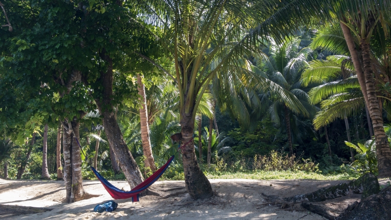 Am Rand hänge ich meine Hängematte auf – weggesteckt inmitten der Palmen. Einen kleinen Ausflug mit dem Kanu mache ich aber doch noch. Es ist allerdings sehr anstrengend, da ich ein sehr großes, schweres Boot mit einem Schmalen Stechpaddel bekomme. So bleibe ich in Küstennähe und fahre zu den Mangroven in der nachsten Bucht.