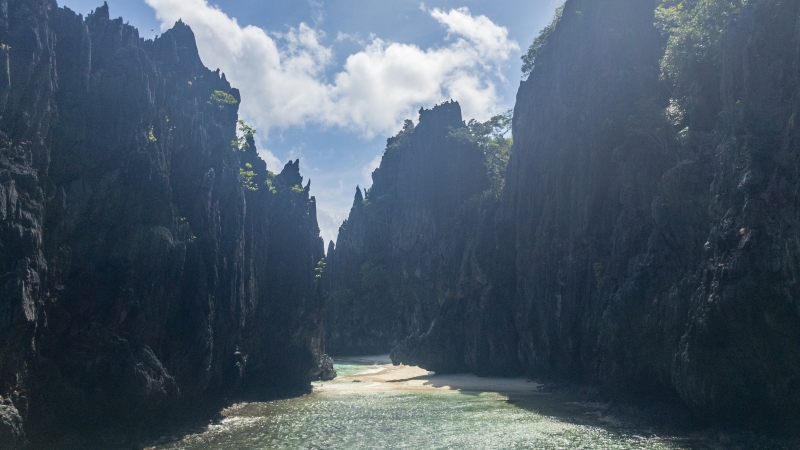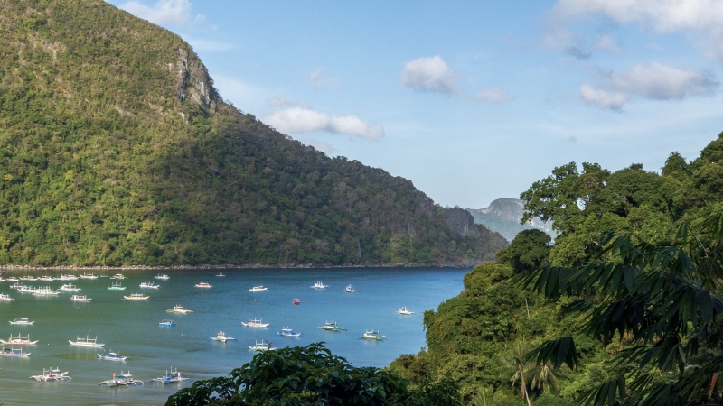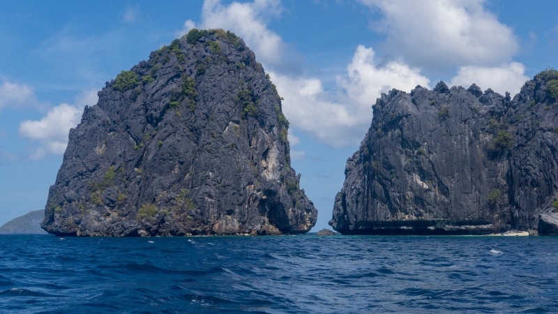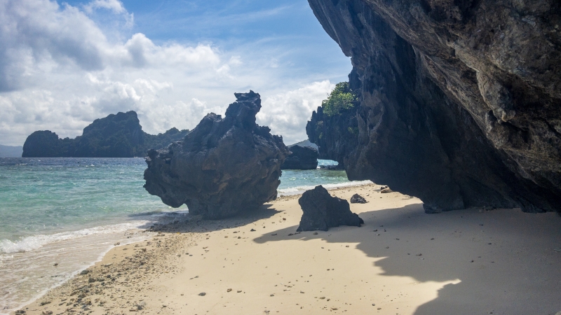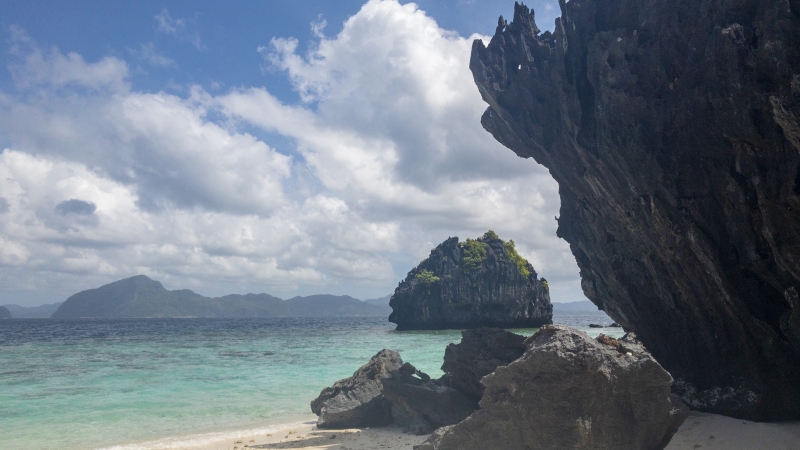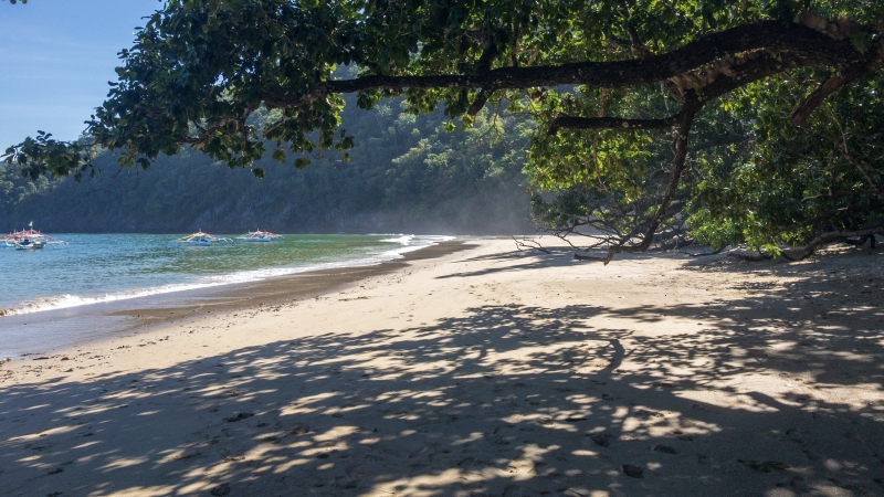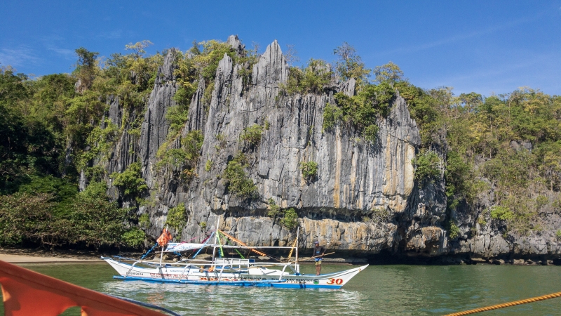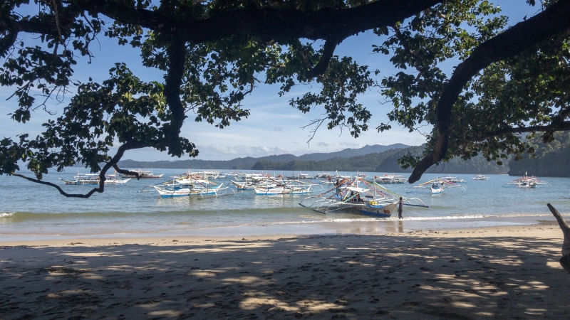 Es geht mit der üblichen Warterei los. um 9:20 geht’s dann schließlich los – allerdings zunächst zum White Beach wo wir noch ein Pärchen aufnehmen. Dann geht es in die Bucht. Die Inseln hier sind keine steilen Felsen wie in El Nido sondern grün bewachsene Hügel. Landschaftlich also nicht ganz so bizarr.