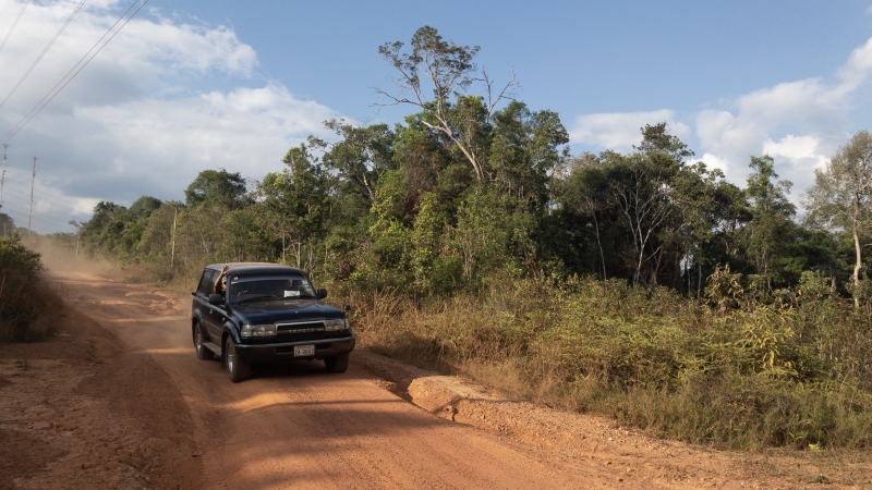 Das Hotel in Pursat hat mir auch gleich das „Taxi“ nach Osoam in den Cardamom Mountains vermittelt. Um 10:00 soll es losgehen. Es dauert dann aber doch bis kurz nach 12:00 bis der Toyota Landcruiser endlich da ist. Geduld kann man hier lernen. „Shared Taxi“ bedeutet in diesem Fall, dass in dem Fünfsitzer neun Leute Platz finden müssen. Das ist nicht gerade bequem und meine Knie schmerzen trotz zweier Schmerztabletten teuflisch.